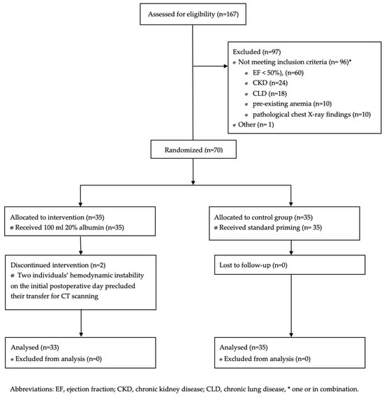 The study targeted 70 individuals scheduled for elective open-heart surgeries, encompassing procedures such as ascending aorta surgery, coronary artery bypass grafting, and heart valve replacement or repair, either independently or in combination, without the use of hypothermic circulatory arrest. We did not include patients with a history of reduced left ventricular ejection fraction (EF < 50%), chronic kidney disease, chronic lung disease, pre-existing anemia, or pathological chest X-ray findings before surgery. Randomization was conducted using a web-based, computer-generated random sequence. Patients were allocated into two groups—those receiving an additional 100 mL of 20% human albumin and those receiving standard CPB priming solution—in a 1:1 ratio.