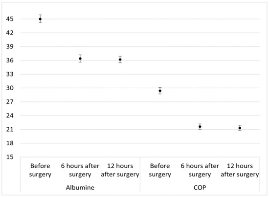 Similar results were obtained for COP. There was no interaction between albumin infusion and time on the COP, F(2, 136) = 1.80, p = 0.169, indicating that the effect of infusion on the level of COP is the same 6 and 12 h after surgery. The analysis of the main effects of the two-way mixed ANOVA showed that the COP does not differ depending on albumin infusion, F(1, 68) = 1.13, p = 0.291, whereas it differs depending on time, F(2, 136) = 320.03, p < 0.001, ηG2 = 0.68 (high effect size). The level of COP is significantly higher before surgery (mean = 29.4, 95% CI 28.7–30.1) than 6 (mean = 21.6, 95% CI 21.0–22.2) and 12 h after surgery (mean = 21.3, 95% CI 20.8–21.9), p < 0.001 (Figure 2).