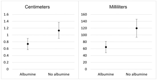 A one-way MANCOVA was conducted to determine whether there were any statistically significant differences between the adjusted means of the combined right and left sides of pleural effusion (cm and mL) between albumin infusion, after controlling for the effect of the covariates (albumin and COP before surgery). All statistical analyses were performed by using the core package of Jamovi statistical software Ver. 2.5 (https://www.jamovi.org, accessed on 15 December 2024). An alpha level of 0.05 was used for all the statistical analyses. Despite the within-subjects nesting of the data, the between-factor nature of the design precluded the necessity for p-value correction. The power of analysis was 0.998, as assessed by the G*Power program 3.1.9.7.
