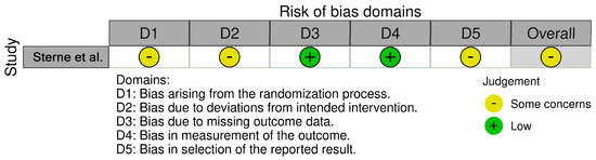RCTs were evaluated using the Revised Cochrane risk-of-bias tool for randomized trials (RoB 2) [updated 22 August 2019] [19], which assesses five domains: the randomization process, deviations from intended interventions, missing outcome data, measurement of the outcome, and selection of the reported result. Each domain was rated as “low” risk, “high” risk, or “some concerns”.