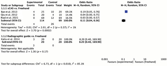 The sCAS group was associated with a decreased rate of iatrogenic root damage compared to the freehand technique (OR = 0.11; 95%CI: 0.04 to 0.36; p < 0.001; I2 = 1%). Conversely, the use of radiographic guides did not prove better than the freehand approach (OR = 8.20; 95%CI: 0.40 to 169.90; p < 0.001; I2 = Not applicable) (Figure 3).