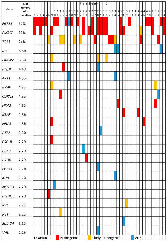 - Ross, J.S.; Wang, K.; Al-Rohil, R.N.; Nazeer, T.; Sheehan, C.E.; Otto, G.A.; He, J.; Palmer, G.; Yelensky, R.; Lipson, D.; et al. Advanced Urothelial Carcinoma: Next-Generation Sequencing Reveals Diverse Genomic Alterations and Targets of Therapy. Mod. Pathology. 2014, 27, 271–280. [Google Scholar] [CrossRef]