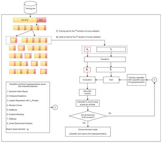 Eight classifiers were used: Gaussian Naïve Bayes (GNB) [11]; K-Nearest Neighbors (KNN) [11]; Logistic Regression with L2 regularization (LR) [12]; Random Forest (RF) [13]; AdaBoost (ADB) [14]; Gradient Boost (GB) [15]; eXtreme Gradient Boost (XGB) [16]; and Linear Discriminant Analysis (LDA) [17]. The rationale behind selecting these predictive models is as follows: (i) the selected models represent five well-known groups: ensemble; Gaussian process; nearest neighbor; linear models; and discriminant analysis, and (ii) these models have been widely utilized in previous studies to predict ICU admission [18,19,20] and COVID-19 severity risk [5,8,9]. The best predictive model was selected according to the highest F1-score that was estimated using a stratified 5-fold cross-validation strategy applied to the training set. Figure 1 presents the schematic diagram of the model selection procedure.
