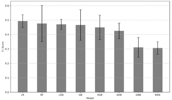 Our model achieved a moderate F1-score of 0.472 with a 0.600 recall and 0.389 precision. That is to say, the model shows a satisfactory ability to identify positive cases but has lower reliability in its positive predictions. This is a natural outcome of selecting a low decision-making threshold value (the best predictive model, LR, has a threshold value of 0.18; see Table 3). It is worth noting that having high recall might be beneficial in cases where missing positives is more costly, for example, in medical diagnoses. Another possible cause of the moderate F1-score is class imbalance. Recall that our dataset has a skewed class distribution (see Section 2.1).