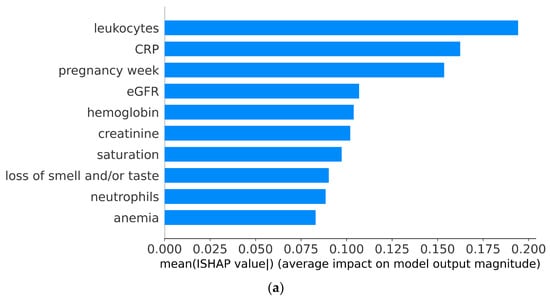 We utilized a SHAP analysis to assess the importance of each feature on ICU admission prediction using the trained LR classifier. Figure 3a,b depicts the bar and beeswarm plot of the ten most important features according to SHAP values. In particular, the bar plot shows the ranking of the features in terms of their importance. In this case, we can see that leukocytes, CRP, and pregnancy week are the most important features on average. On the other hand, the beeswarm plot is designed to display an information-dense summary of how the top features in a dataset impact the model’s output. Each instance of the given explanation is represented by a single dot on each feature. Each position of the dot is determined by the SHAP value of that feature. Dots “pile up” along each feature row so that the width at a certain point represents the density. The color code indicates the protective (blue) or higher risk (red) of admission to the ICU. For example, the high value of leukocytes yields positive SHAP values, meaning the direct dependence between leukocytes and a higher risk of admission to the ICU. At the same time, the high value of hemoglobin decreases the risk of ICU admission as it corresponds to negative SHAP values.