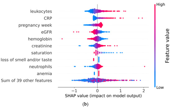 SHAP analysis is an effective technique to quantify the importance of features [25]. The results of our SHAP analysis demonstrate that the most important features are leukocyte and C-reactive protein. Leukocytosis is a hematological parameter associated with more severe COVID-19 infection in pregnant women, along with neutrophilia, lymphopenia, and elevated platelet counts [26,27]. While the precise pathophysiological explanation of these hematological abnormalities in COVID-19 patients is still unclear, changes in the number of one or more blood cells have often been reported frequently in patients infected with SARS-CoV-2 [28]. Leukocytosis and neutrophilia are inflammatory responses associated with disease severity and bad outcomes. Although neutrophilia may be more specific to severe disease than leukocytosis [29], leukocyte counts have been observed more frequently, compared with neutrophil ones, in more severe cases of COVID-19-infected pregnant women [30]. C-reactive protein (CRP) is another relevant factor associated with the risk of ICU admissions for pregnant women infected with COVID-19. CRP is recognized as a robust marker of acute systemic inflammation and severe infection [31]. Elevated CRP concentrations are associated with COVID-19 severity [32] but are also typically reported in severe viral infections, including H1N1 influenza pneumonia [33,34]. Elevated CRP levels are associated with severe COVID-19 cases in pregnancy [35] and have been linked with ICU admission, preterm labor, and poor maternal outcomes [36], as they reflect underlying inflammatory responses that are heightened in severe infections [37]. We note that the “importance” of the feature indicates the “association” between the feature and the output of the model.