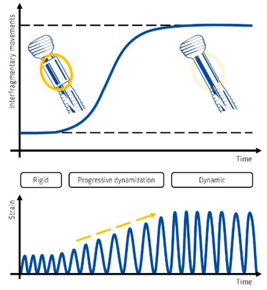 A conceptual schematic showing how the support provided to the cis cortex by the Variable Fixation Locking Screw evolves over time, along with its impact on interfragmentary movements (top graph) and strain (bottom graph). Initially, a stable and well-centered resorbable sleeve (yellow circle) minimizes both interfragmentary movement and strain. As the sleeve gradually degrades, the support from the VFLS progressively decreases, resulting in a controlled increase in interfragmentary displacement and strain (yellow arrow). This gradual change is limited by design, allowing the newly formed bone to complete its calcification and remodeling processes [14,18,19,20].