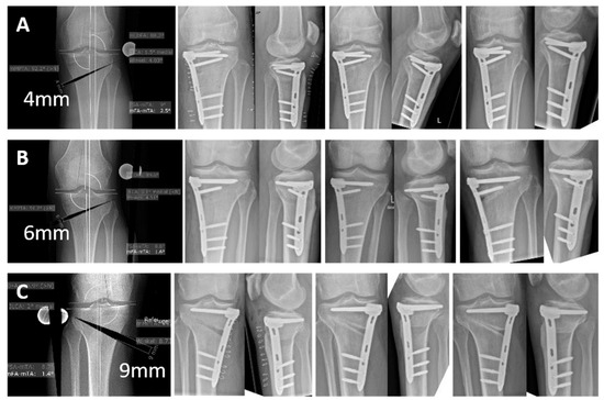 The figure shows 3 exemplary cases of HTOs that were treated with VFLS. The first image in the series shows the pre-operative planning in each case, followed by the X-ray checks post-operatively, after 12 weeks and 6 months. (A) 4 mm opening wedge, (B) 6 mm opening wedge, (C) 9 mm opening wedge.