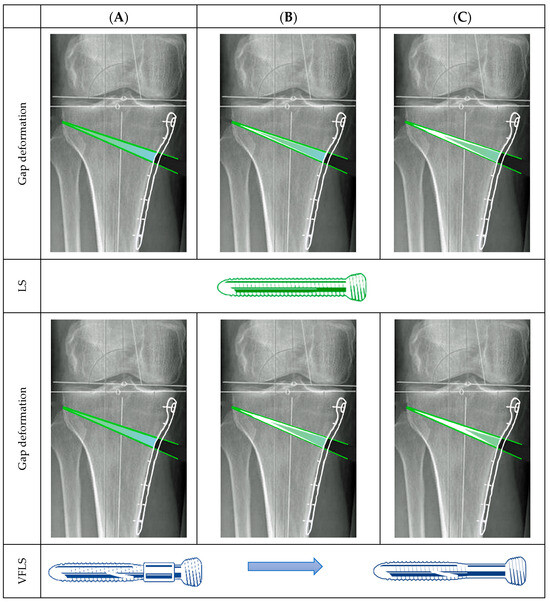 This image illustrates the expected strain distribution within the osteotomy gap. Green areas indicate where the strain is expected to support new bone formation, while light-blue areas show strain levels that are likely too low to promote bone apposition (white). (A) Initial strain conditions at the start of treatment using both standard locking screws (LSs) and Variable Fixation Locking Screws (VFLSs). Strain levels with LS fixation decrease over time, potentially leaving parts of the gap unfilled for extended periods. (B,C) As the degradable sleeve of the VFLS resorbs, gap strain conditions evolve, progressively increasing the likelihood of reaching strain levels conducive to bone formation throughout the entire gap.