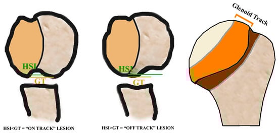 The concept of the glenoid track is a unifying theory that takes into account the size and degree of glenoid bone loss but crucially also factors in the specific location of the defect to determine if the lesion will engage. A Hill–Sachs lesion that is larger than the glenoid track is considered an “off-track” deformity (Figure 2 and Figure 3). Yamamoto et al. proposed that these “off-track” Hill–Sachs lesions are located outside the contact area of the glenoid and humeral head, placing them at higher risk of engagement and thus recurrent instability [14]. As glenoid bone loss increases, the contact area decreases, thus increasing the likelihood that a Hill–Sachs lesion is “off-track”. This distinction is critical to operative decision making, as patients with engaging lesions are considered to be at higher risk of recurrent instability and thus warrant surgical consideration [13,17]. In fact, Kurokawa et al. recommended that the glenoid track should be utilized to assess engaging Hill–Sachs lesions rather than dynamic intraoperative assessment [18]. They believed that assessing the lesions intraoperatively may lead to overdiagnosing engaging lesions due to ligamentous instability, allowing the humeral head to shift anteriorly. Thus, they proposed that the “true” definitions of engaging Hill–Sachs were those with lesions that exceeded the size of the glenoid track or that engaged during intraoperative assessment following Bankart repair. In a follow-up study of 100 shoulders with recurrent anterior instability, 94 had Hill–Sachs lesions and 7 were found to be engaging based on the glenoid track definition [18].