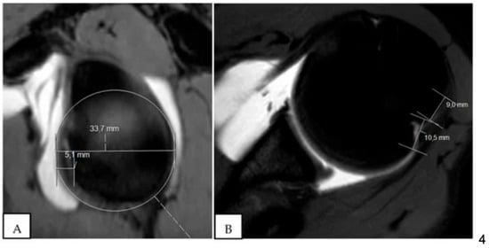 Figure 2. On-track lesion on magnetic resonance imaging (MRI) arthrography. (A) In this case, the glenoid track is equal to 23 mm (33 − 5 × 0.83 = 23). (B) The Hill–Sachs index (HSI) is 19.5 mm (10.5 + 9). It is an on-track lesion because the glenoid track (23 mm) is greater than the HSI (19.5 mm) [16].