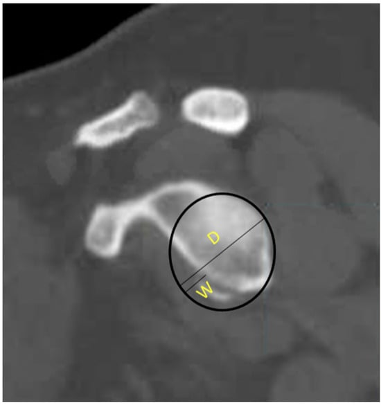 Figure 5. Best-fit-circle method of measuring glenoid bone loss. D = Diameter of best-fit circle, W = Width of defect, W/D = % of bone loss.