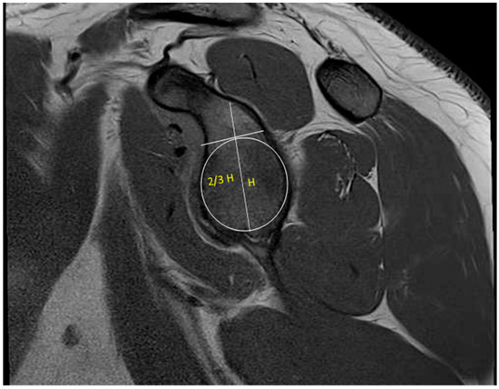 There is ample evidence that MRI is capable of quantifying the degree of glenoid bone loss [39]. Gyftopoulos et al. demonstrated that MRI could be accurately used to determine glenoid bone loss, with results comparable to CT and 3D CT [40]. Makovicka et al. recently proposed a new MRI-based technique for calculating glenoid bone loss. Instead of utilizing the borders of the glenoid to create a perfect circle, they suggested using two-thirds of the glenoid height to establish the diameter of a perfect circle of the glenoid (Figure 8). They found that this method produced similar results for the area of the perfect circle with superior reproducibility and consistency, allowing for a more objective assessment of glenoid bone loss [41]. MRI has also been able to identify on-track versus off-track Hill–Sachs deformities with a sensitivity of 72% and specificity of 88% [40]. Gyftopoulos et al. described a method of assessing glenoid bone loss utilizing the aforementioned circle method on 3D MRI. They found a direct relationship between the degree of glenoid bone loss and engaging Hill–Sachs lesions [42]. Stillwater et al. also demonstrated that 3D MRI achieved similar results in measuring humeral head loss, Hill–Sachs size, percent of humeral head loss, and percent of glenoid bone loss [43]. While these studies contained a limited number of participants, they suggest it may be possible to utilize 3D MRI in place of CT or 3D CT. This would help reduce the radiation exposure to patients and lower costs by requiring one fewer advanced imaging modality.