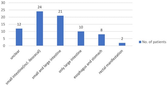 A total of 7 out of 134 (5.2%) patients had a stoma at the time of the study. On average, patients had been hospitalized twice due to their chronic inflammatory bowel disease since the initial diagnosis. The pattern of disease involvement was also analyzed, with Figure 1 showing that CD patients were primarily affected in the small intestine (including the ileocecal valve), followed by involvement of both the small and large intestine. In patients with ulcerative colitis, the initial pattern of involvement was mostly pancolitis, followed by left-sided colitis and, finally, proctitis (see Figure 2).