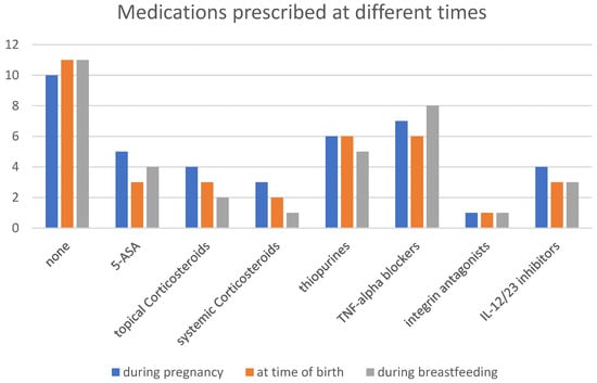 In general, except for methotrexate, JAK inhibitors, sphingosine 1-phosphate (S1P) modulators, and thalidomide, most IBD medications are regarded as safe and well tolerated during pregnancy, without an increased risk of complications [,]. Notably, our study provides evidence supporting this overall safety profile with concrete data on the favorable tolerability of the previously mentioned medications. Within our study group, medications including 5-ASA, topical corticosteroids, thiopurines, TNF-alpha blockers, integrin antagonists, and IL-12/23 inhibitors were primarily administered during pregnancy and breastfeeding. These treatments exhibited no adverse events or pregnancy-associated complications, emphasizing their safety for use in this specific patient population []. As noted, well-controlled disease activity (clinical remission) is the most critical prognostic factor for an uncomplicated pregnancy.