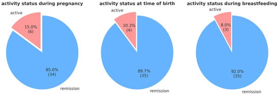 We analyzed the disease activity status during pregnancy, at the time of birth, and during breastfeeding. We found that 14.6% (n = 6) of the patients experienced at least one acute flare during pregnancy. At the time of birth, the proportion was 10.3% (n = 4) and, during breastfeeding, it was 7.2% (n = 3).