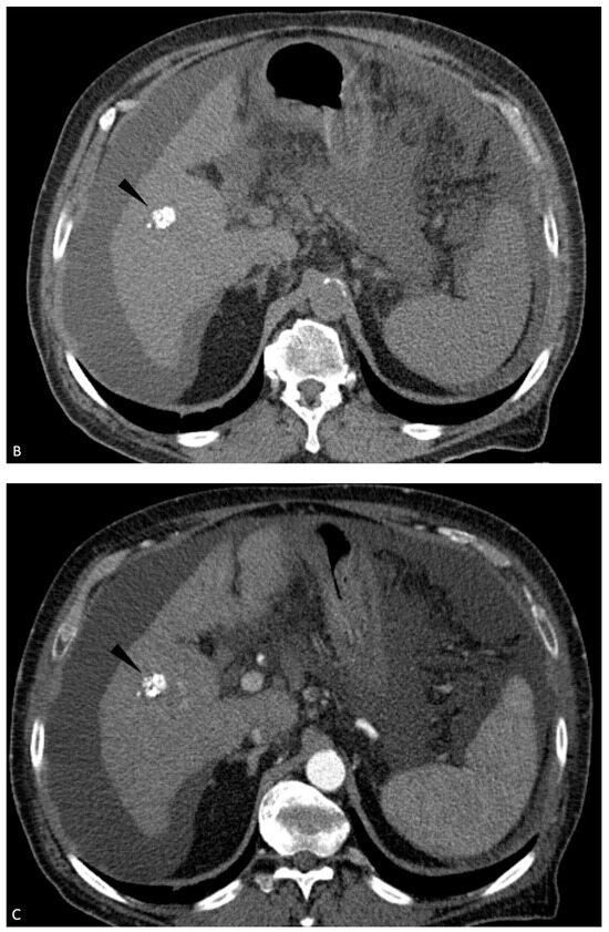 A 63-year-old male with cirrhosis due to MASH. (A) CEUS and accompanying grayscale image at 14 s following administration of Lumason®. Black arrow corresponds to internal enhancement thought to represent residual disease. Enhancing area demonstrated washout on delayed images. (B,C) Corresponding same-day CT showing no viable, enhancing lesion (black arrowheads), (B) non-contrast CT, (C) late arterial-phase CT.