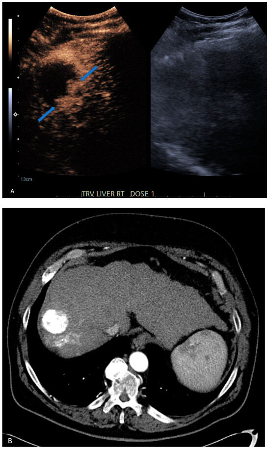 - Faccia, M.; Garcovich, M.; Ainora, M.E.; Riccardi, L.; Pompili, M.; Gasbarrini, A.; Zocco, M.A. Contrast-Enhanced Ultrasound for Monitoring Treatment Response in Different Stages of Hepatocellular Carcinoma. Cancers 2022, 14, 481. [Google Scholar] [CrossRef]
