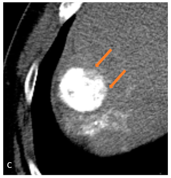 A 63-year-old male with hepatitis C-induced cirrhosis. (A) CEUS demonstrates two areas of focal peripheral nodular enhancement in the treated lesion (blue arrows), indicating residual disease. Initial follow-up CT (B) was read as non-viable lesions (LR-treated). Three-month follow-up CT confirmed CEUS findings of residual disease. Retrospective review of the initial CT demonstrated nodular regions of enhancement, better seen on enlarged view of the lesion ((C), orange arrows).