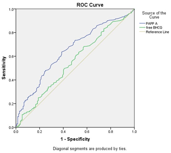 Consequently, first-trimester biomarkers may offer opportunities for early diagnosis and treatment, potentially improving maternal and fetal outcomes. Abnormal levels of maternal serum biomarkers, used in the first-trimester screening, have been associated with adverse maternal and perinatal outcomes [,]. Low levels of pregnancy-associated plasma protein-A (PAPP-A) and free beta human chorionic gonadotropin (free β-hCG), in the absence of aneuploidy, have been associated with an increased risk of preterm birth, pre-eclampsia, and low birth weight [,,]. Recently, attention has focused on these biomarkers as potential predictors of GDM []. While some studies have suggested that low levels of PAPP-A and free β-hCG are associated with an increased risk of GDM [,,], others have reported no significant association [,,].
