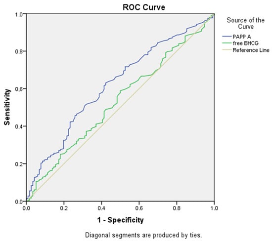 Receiver operating characteristic (ROC) analysis showed that the optimal cut-off point for PAPP-A MoM in predicting the development of gestational diabetes was 0.815, yielding a sensitivity of 61.4% and a specificity of 61.6%, with an area under the curve (AUC) of 0.649 (p < 0.001). ROC curve of free β-hCG, cut-off value 0.965, AUC 0.55, sensitivity of 53%, and a specificity of 55.2% (p = 0.091).