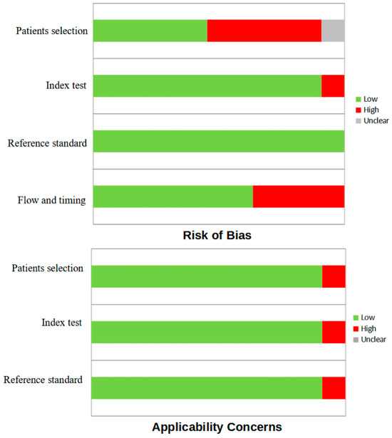 - Whiting, P.F.; Rutjes, A.W.; Westwood, M.E.; Mallett, S.; Deeks, J.J.; Reitsma, J.B.; Leeflang, M.M.; Sterne, J.A.; Bossuyt, P.M. QUADAS-2 Group. QUADAS-2: A revised tool for the quality assessment of diagnostic accuracy studies. Ann. Intern. Med. 2011, 155, 529–536. [Google Scholar] [CrossRef] [PubMed]