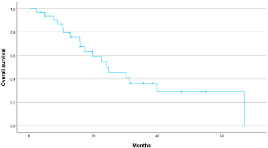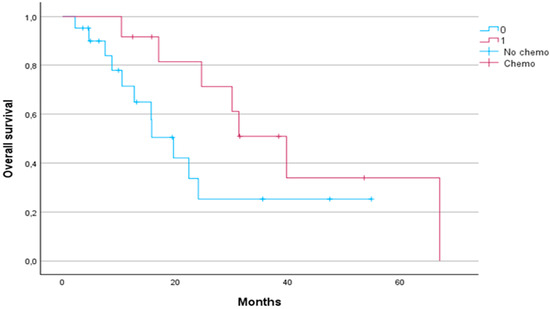Patients who received chemotherapy had a significantly longer median OS compared to patients who did not receive chemotherapy (31.33 months vs. 15.8 months, respectively, p < 0.05) (Figure 5).