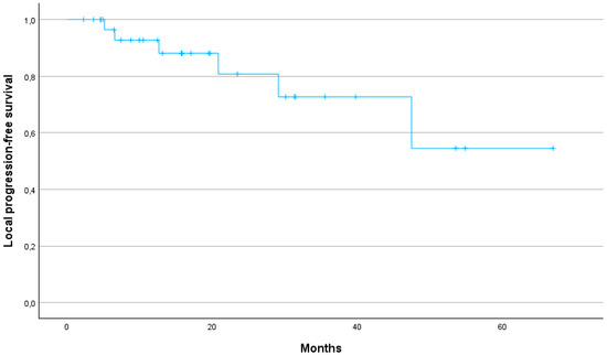 In patients with local progression, the mean prescribed radiotherapy dose was 32 Gy (range, 30–45 Gy). For all patients, the mean biologically effective dose (BED10) was 52.7 Gy (range, 48–85.5 Gy). For those with local disease progression, the mean BED10 was 51.4 Gy (range, 48–85.5 Gy).
