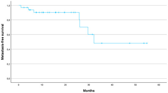Data were retrospectively collected and statistical analysis was performed for endpoints, including progression-free survival (PFS), local progression-free survival (LPFS), metastasis-free survival (MFS) and overall survival (OS), using the Statistical Package for Social Sciences, version 27 (SPSS Inc., Chicago, IL, USA). Progression-free survival was determined from the start of treatment until the observation of progression/recurrence or until the last follow-up if no event was observed. Overall survival was determined from the date of histological diagnosis. PFS and OS curves were calculated using the Kaplan–Meier method. The analysis included the chi-square test of independence to examine relationships between categorical variables. A significance level (α) of 0.05 was used to determine statistical significance.