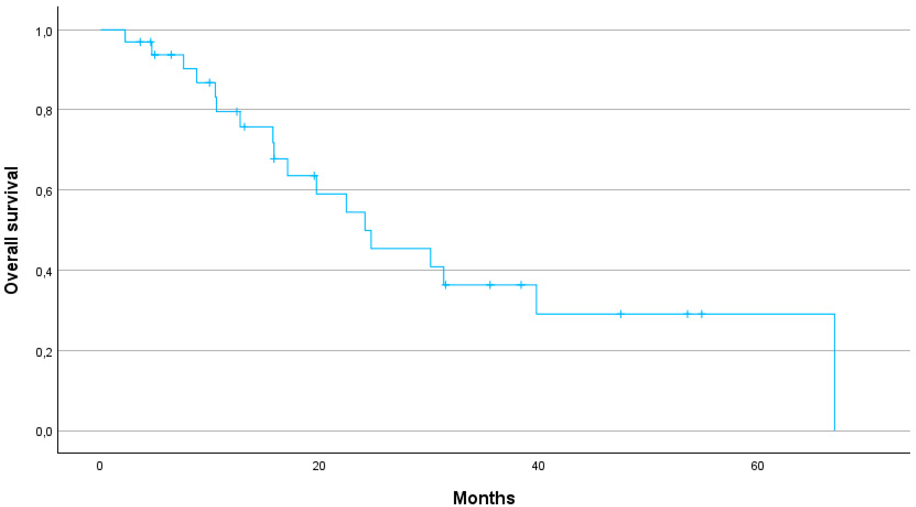 The median OS for all patients was 24.1 months (95% CI: 23.6–43). The 1-year, 2-year and 3-year OS rates were 75.8, 50 and 29%, respectively (Figure 1).