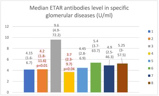 Median ETAR antibody levels in specific glomerular diseases (U/mL). Key: 1—membranous nephropathy; 2—focal and segmental glomerulosclerosis; 3—lupus nephritis; 4—IgA nephropathy; 5—mesangial proliferative (non-IgA) glomerulonephritis; 6—control group; 7—c-ANCA vasculitis; 8—p-ANCA vasculitis. The groups with values in red were statistically lower than the control group.