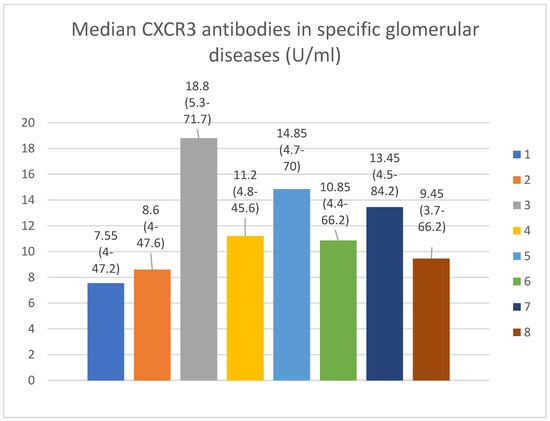 Median CXCR 3 antibodies in specific glomerular diseases (U/mL). Key: 1—membranous nephropathy; 2—focal and segmental glomerulosclerosis; 3—lupus nephritis; 4—IgA nephropathy; 5—mesangial proliferative (non-IgA) glomerulonephritis; 6—control group; 7—c-ANCA vasculitis; 8—p-ANCA vasculitis.