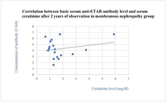 We observed a correlation between the basic level of ETAR antibodies and creatinine level after 2 years of observation in membranous nephropathy. There is no publication about ETAR or ETAR antibodies and membranous nephropathy. Nevertheless, membranous nephropathy is an autoimmunologic disease with the common presence of anti-PLA2R antibodies and other antibodies in serum [,]. The appearance of the systemic antibodies in the course of membranous nephropathy increases the probability that ETAR antibodies also have some connection with the pathogenesis of the disease, or that they are markers of the disease. Our results suggest that a higher ETAR antibody level may be a negative predictor of the prognosis in membranous nephropathy, but this requires confirmation based on bigger groups of patients. The ETAR antibodies in our group did not correlate with the PLA2R antibody level, so the real mechanism of ETAR antibodies’ connection with the pathogenesis of membranous nephropathy is still unknown.