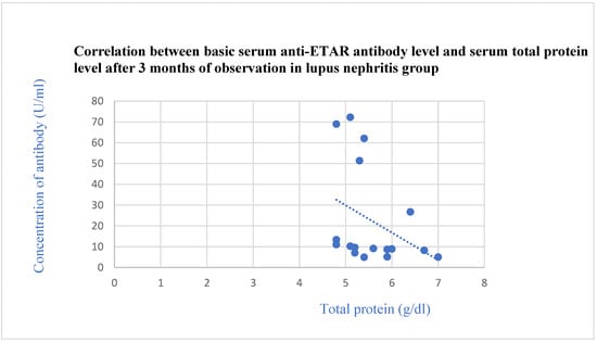 Correlation between basic serum anti-ETAR antibody level and serum total protein level after 3 months of observation in lupus nephritis group (r = −0.54; p = 0.03). Blue dots represent particular patients. Blue dotted line—trend line.