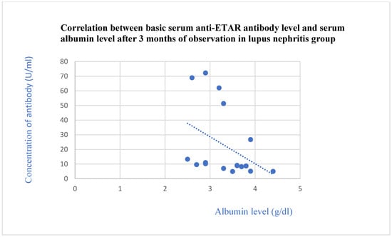 Correlation between basic serum anti-ETAR antibody level and serum albumin level after 3 months of observation in lupus nephritis group (r = −0.62; p = 0.01). Blue dots represent particular patients. Blue dotted line—trend line.