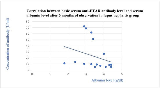 Correlation between basic serum anti-ETAR antibody level and serum albumin level after 6 months of observation in lupus nephritis group (r = −0.57; p = 0.03). Blue dots represent particular patients. Blue dotted line—trend line.