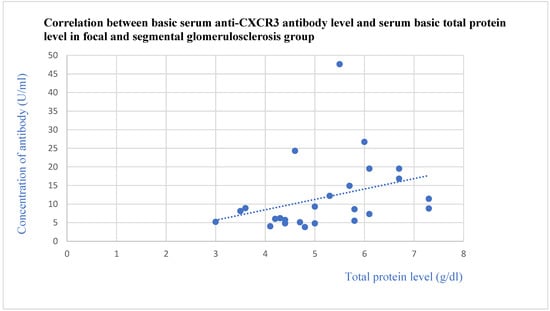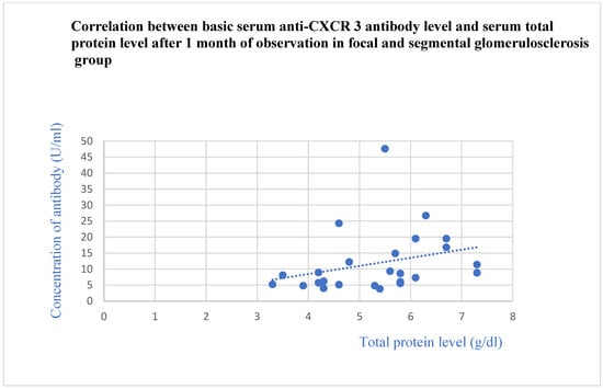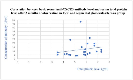 Correlation between basic serum anti-CXCR3 antibody level and serum total protein level after 3 months of observation in focal and segmental glomerulosclerosis group (r = 0.43; p = 0.04). Blue dots represent particular patients. Blue dotted line—trend line.