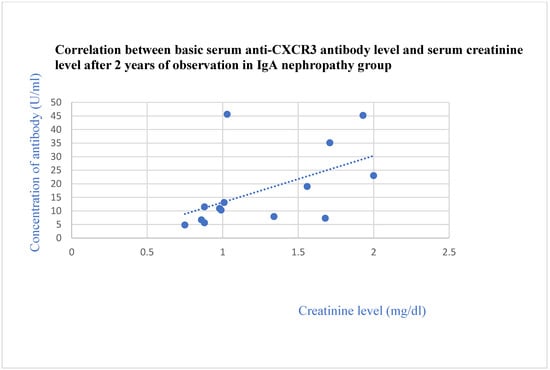 The basic anti-CXCR3 antibodies correlated with the creatinine level after 2 years in the IgA nephropathy group (p = 0.01, Figure 12).