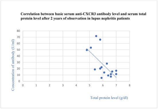 Correlation between basic serum anti-CXCR3 antibody level and serum total protein level after 2 years of observation in lupus nephritis group (r = −0.58; p = 0.03). Blue dots represent particular patients. Blue dotted line—trend line.