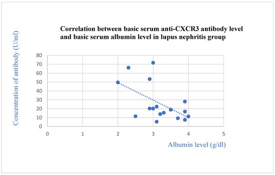 Correlation between basic serum anti-CXCR3 antibody level and basic serum albumin level in lupus nephritis group (r = −0.53; p = 0.02). Blue dots represent particular patients. Blue dotted line—trend line.
