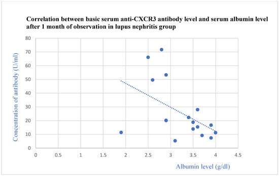 Correlation between basic serum anti-CXCR3 antibody level and albumin level after 1 month of observation in lupus nephritis group (r = −0.51; p = 0.04). Blue dots represent particular patients. Blue dotted line—trend line.
