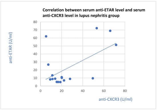 The positive correlation between anti-ETAR and anti-CXCR3 antibodies in the serum of lupus nephritis and IgA nephropathy patients may suggest systemic activation in these diseases. Systemic lupus erythematosus is a systemic disease. IgA nephropathy may also exhibit systemic signs in the course of Henoch–Schonlein syndrome []. A joint influence of the antibodies on the course of the diseases is also possible, and simultaneous analyses of many antibodies may be useful in the evaluation of their influence on the course of the diseases []. The only known simultaneous assessment of anti-ETAR and anti-CXCR3 antibodies is described in patients with Sjogren syndrome. In this case, the anti-CXCR3 antibody levels were lower, and anti-ETAR antibody levels were higher, than those of the healthy control group. Nevertheless, both these antibodies were changed simultaneously in this group of patients [].