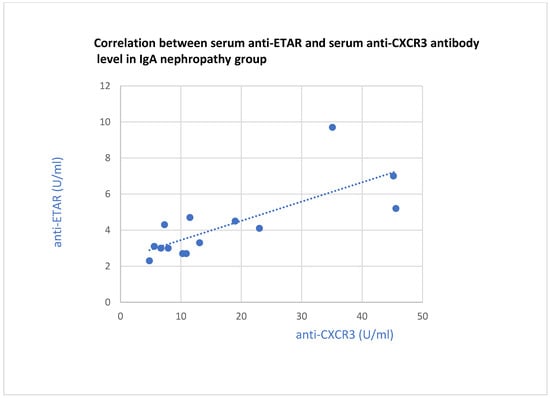 The anti-ETAR antibody correlated with the anti-CXCR3 antibody in the groups of patients with lupus nephritis (p = 0.01, Figure 16) and IgA nephropathy (p = 0.001, Figure 17).
