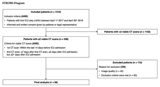 In total, 1310 patients from two surgical ICUs were included in the study. Out of these patients, 1102 participants did not receive at least two viable CT scans. Out of the remaining 208 patients, an additional 110 patients had to be excluded due to insufficient vertebral levels in the CT scan or poor image quality, leaving 98 participants for the final analysis (Figure 2).