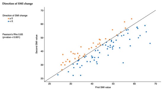There was no significant difference in the direction of the SMI change depending on the magnitude of the SMI value generated form the first CT scan (Pearson’s rho: 0.83 (p < 0.001) (Figure 3).