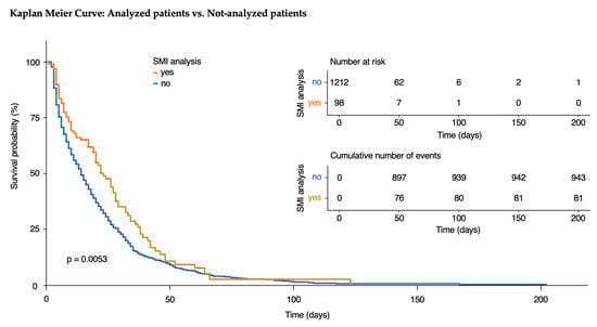 Survival probability of included and analyzed patients versus included but not analyzed patients presented using a Kaplan–Meier curve. The orange line indicates patients who were analyzed, and the blue line indicates patients who were not. Log rank test between the groups showed a significant difference in survival (p = 0.0053).