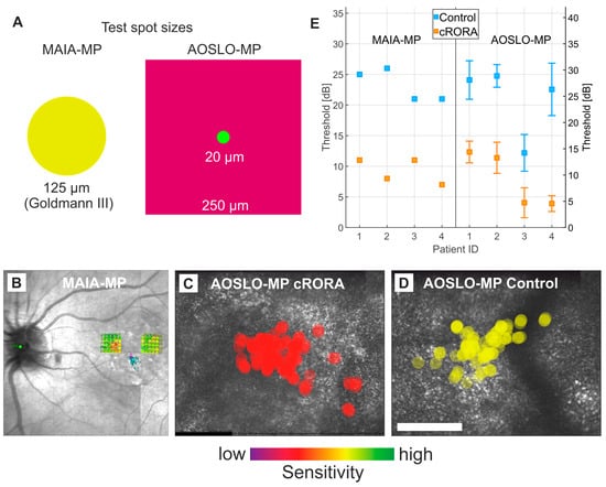 Retinal sensitivity thresholds at cRORA lesions and in-eye control regions in iAMD. (A) Spot size of the MAIA-MP (achromatic stimulus) and the AOSLO-MP (543 nm stimulus within the larger 840 nm AOSLO raster). (B) MAIA-MP testing grid and results of retinal sensitivity at the cRORA lesion (17 dB, red) and control region (27 dB, yellow) in patient #1 (for OCT correlation please consider patient 1 in Figure 1). The green dot highlights the optic disc control, the red cross the central fixation target and the blue dots the foveal fixation control. (C,D) AOSLO-MP test spot size and location at the cRORA lesion (C) and in-eye control region (D) in patient #1. AOSLO imaging shows patches of normal hexagonally arranged cone photoreceptors and areas of hyporeflective structural changes at both sites. (E) Mean sensitivity thresholds at the cRORA lesions and control regions for MAIA-MP and AOSLO-MP for all study patients. Note that both MP devices feature different background illumination and stimulus power range levels as indicated by the distinct left and right y-axis labels. Thus, sensitivity thresholds expressed as the inverse of stimulus power attenuation (in dB) are not directly comparable.
