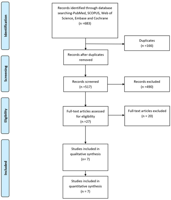 The PRISMA Flow diagram in Figure 1 describes the literature search conducted in this study. We identified six hundred and seventy-nine relevant publications after searching PubMed, SCOPUS, Web of Science, Embase, and Cochrane. After removing duplicates, 538 publications remained. Seven studies that met our inclusion criteria [8,9,13,14,15,16,17] were included in the qualitative and quantitative analysis.