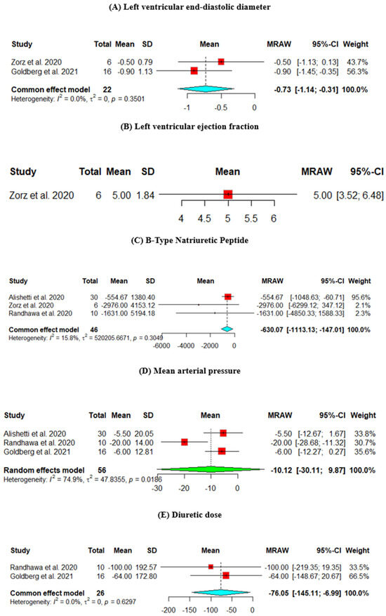 Efficacy outcomes of the change from baseline in the (A) left ventricular end-diastolic diameter, (B) left ventricular ejection fraction, (C) B-type natriuretic peptide, (D) mean arterial pressure, (E) diuretic dose, (F) creatinine, and (G) potassium (Goldberg et al., 2021 [8], Randhawa et al., 2020 [9], Alishetti et al., 2020 [13], Zorz et al., 2020 [17]).