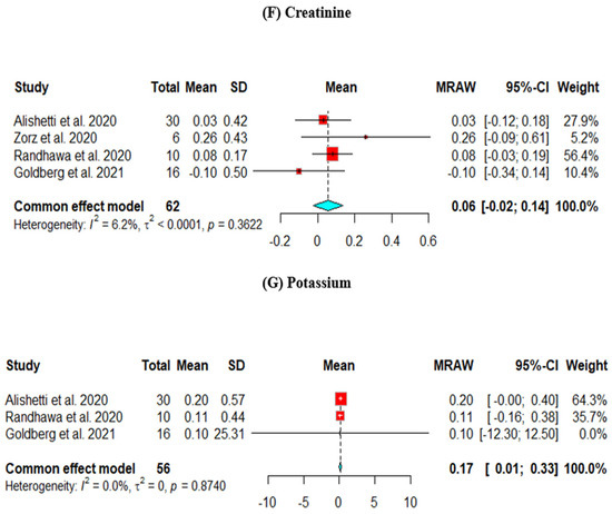 The change in Cr from baseline was assessed across four studies. The results did not show a significant decrease in the Cr level (mean = −0.06, 95% CI [−0.02, 0.14]) (Figure 2F).
